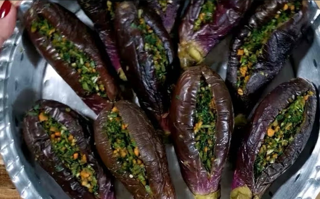 A traditional Persian pickled eggplant stuffed with fresh herbs, garlic, and vegetables, creating a rich, tangy, and aromatic flavor. Perfect as a side dish or appetizer alongside Persian meals.